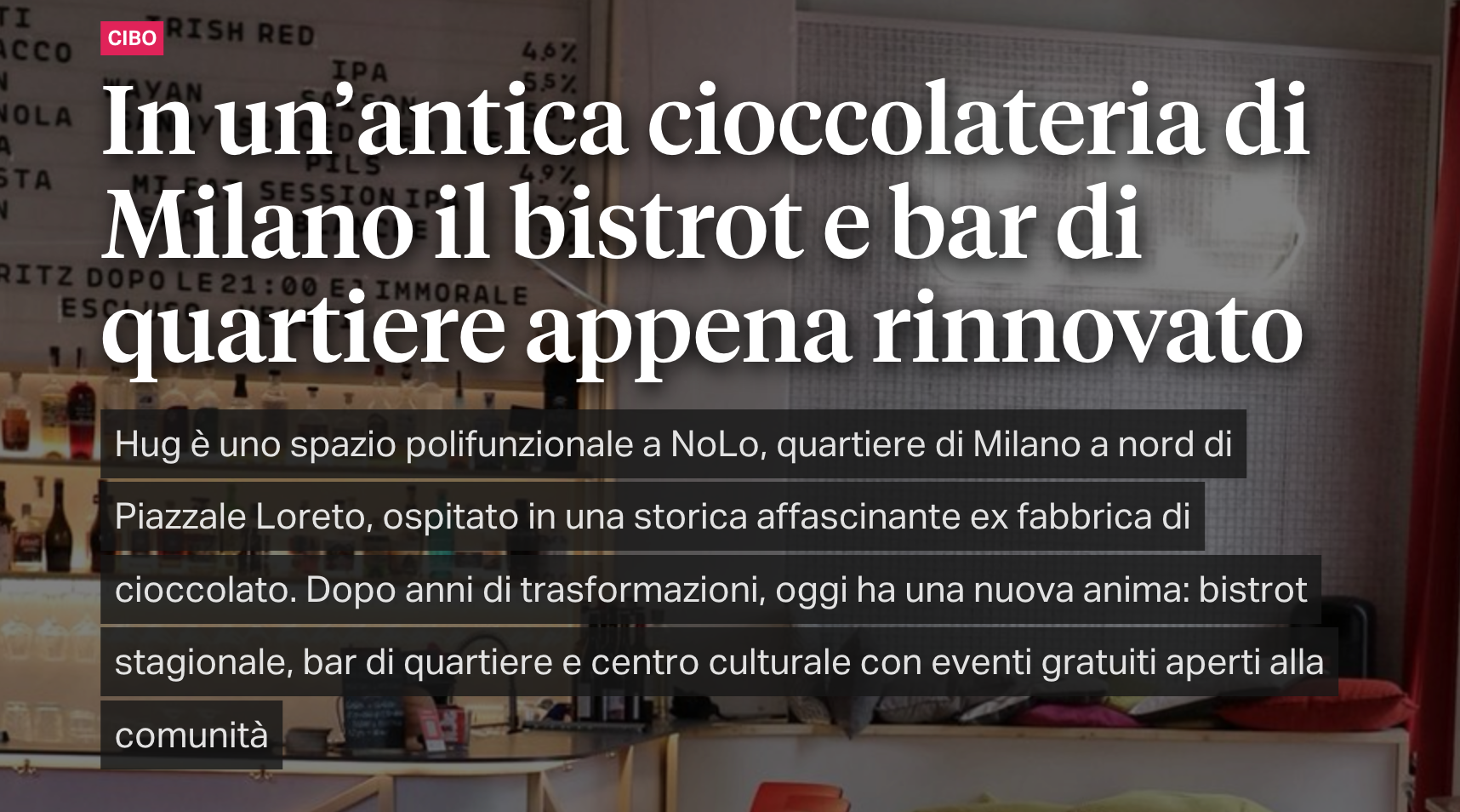 Hug è uno spazio polifunzionale a NoLo, quartiere di Milano a nord di Piazzale Loreto, ospitato in una storica affascinante ex fabbrica di cioccolato. Dopo anni di trasformazioni, oggi ha una nuova anima: bistrot stagionale, bar di quartiere e centro culturale con eventi gratuiti aperti alla comunità.