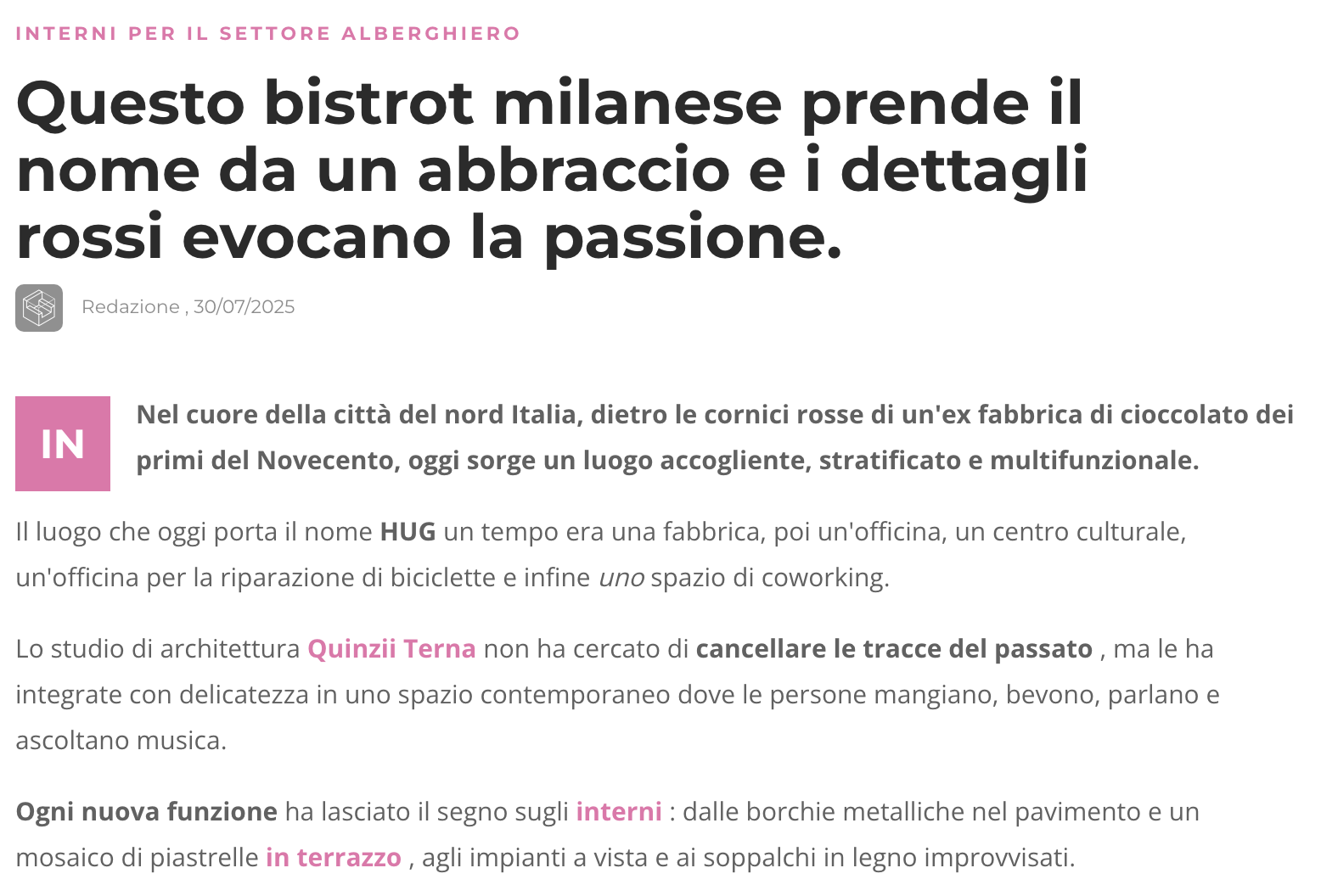 DIZAJN ENTERIJERA. Questo bistrot milanese prende il nome da un abbraccio e i dettagli rossi evocano la passione.